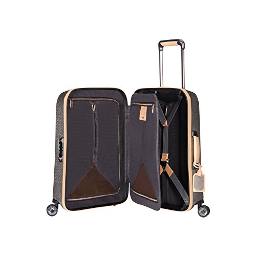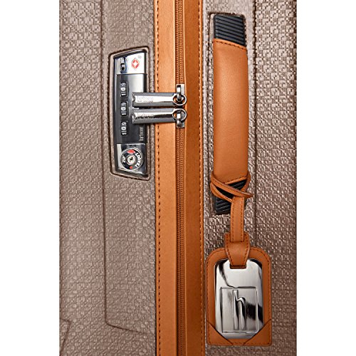 Details: Lightweight, scratch and impact-resistant, metalized Curv material Exceptionally resilient, dual tube aluminum pull handle with leather grip.Premium leather carry handles Smooth rolling double wheels with translucent polycarbonate core Recessed TSA lock Spacious packing compartments Mesh divided, zippered compartment Zippered accessory pocket Elastic cross strapsWeight: 5.1 lbs.Body Dimensions: 21.65" x 15.75" x 8.7"