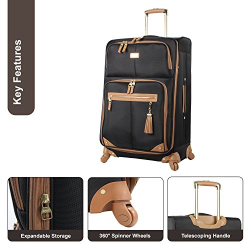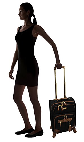 Details: Steven Madden Luggage Soft Side Luggage delivers great durability together with a fashionable design. It is made from polyester fabric to provide your belongs with maximized protection. The use of 360 degree spinner wheels and telescopic push button handle system enables high stability over a variety of surfaces especially crowded airport. This sharp looking piece with Steve Madden signature lining will keep you traveling in style. The dimensions of the suitcase with wheels, handle and stuffed front pocket: 21.5 X 14.2 X 10.2 inches The dimensions of the suitcase without wheels and handle: 20 X 14 X 8 inches The suitcase has been extensively tested to fit the overhead cabin requirements for most airlines The storage capacity is approximately 35L not expanded An additional 4 liters is available by expanding the suitcase The weight of the luggage is approximately 7.8 lb This luggage is covered by a 5 year manufacturer's warranty.