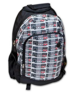 Details: Officially licensed Nintendo Controllers Backpack School Bag. Features a repeating pattern on the front of the classic NES controller. Front pocket opens to reveal compartments for all your small goodies, and includes a handy headphone opening so you can listen to your player while keeping your bag securely zippered. Top of the bag has a zippered pouch for valuables, and there are two net pockets on the sides. Adjustable straps. 100% polyester. Main compartment measures about 15" x 21" x 4".