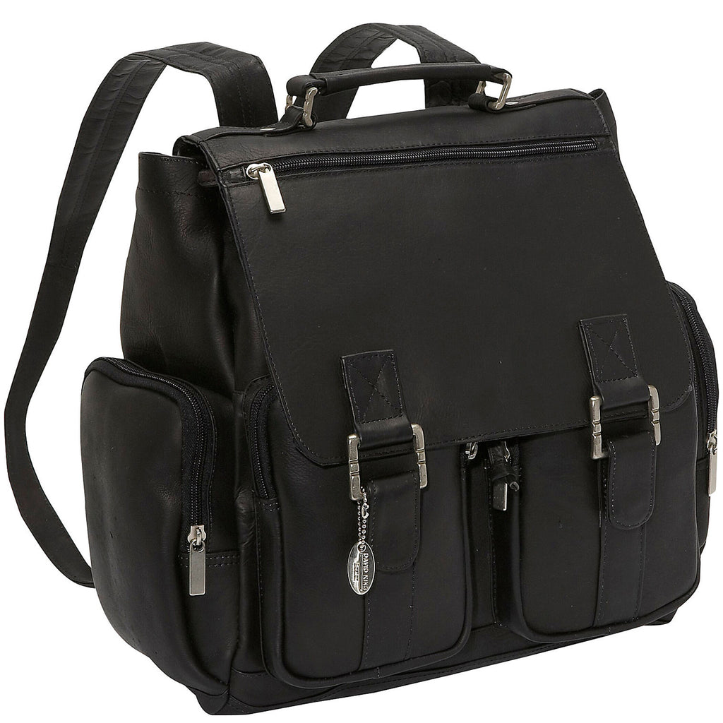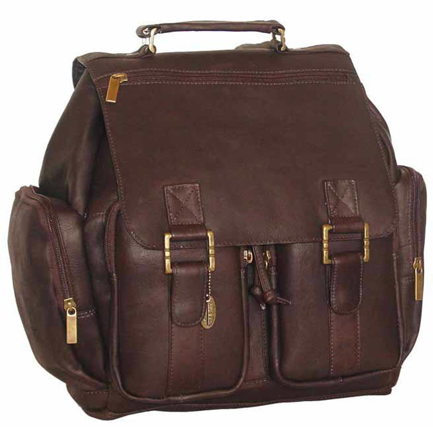 This David King Leather Laptop Backpack with 5 Zipper Pockets, laptop-flap-over backpack, closes with two magnetic tab closures. Below the flap are two large zip pockets. It also features two large side zip pockets, an internal organizer with open pocket, card pockets, and pen slots to keep your belongings in place, and a zip pocket on the flap. The main compartment has a drawstring closure, the shoulder strap is adjustable, and it comes with a loop handle for carrying ease.