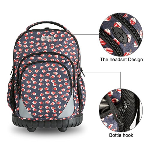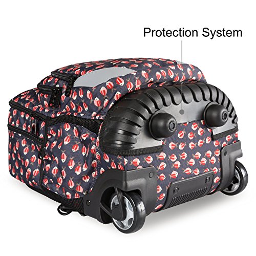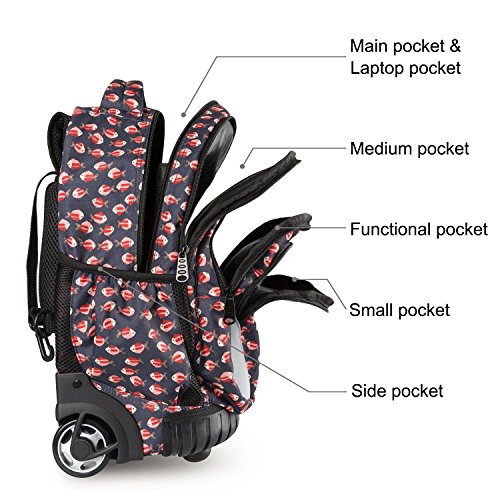 - Colorful washing printing oxford fabric, attractive looking.Thick padded compartment of rolling backpack is big enough for 14 inches laptop. Outer pocket can hold daily necessary stuff like keys, pens, flashdrivers and side bottle pockets.