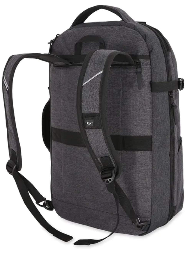 Details: The Swissgear 6067 Getaway 2.0 Big Backpack transfers the same convenience from our iconic carry-ons. Its large silhouette is for the urban explorer who lives for smart transportation and functionality. Its features are unparalleled to any traveling backpack or daypack. Boasting a large main compartment that splits to expose a mesh pocket on either side, a cinched sleeve, and clothing tie-down straps, its front organizational compartment embeds pen dividers, and pockets that can be used to safely store a tablet, ID cards, and chargers. For added accessibility, a sunglasses compartment rests at the top of the pack. An RFID-protected side compartment integrates a padded sleeve that fits most 15" laptops, while an additional zippered pocket expands to allow for 2" of additional packing space. Its side compression straps, padded shoulder straps, and add-a-bag sleeve also play a role in the backpack's impressive abilities. Slip the shoulder straps inside its zippered back panel, and grip its side or top grab handle for a faster excursion to this weekend's getaway.
