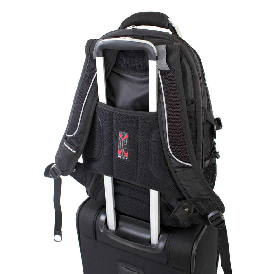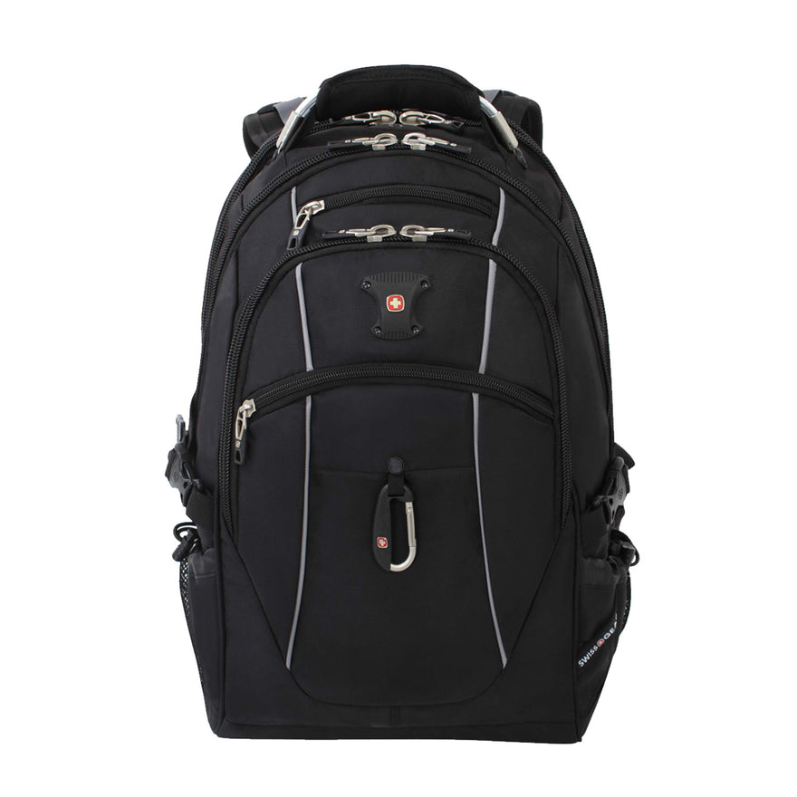 Details: For the absolute ultimate in organization and day to day carrying convenience, the four compartment SWISSGEAR 6677 ScanSmart Laptop Backpack has what it takes to get the job done. Starting with ScanSmart technology, this backpack comes with a dedicated laptop computer compartment that is airport friendly, allowing you to keep most computers up to 17" in size safe and in the backpack when passing through security. Simply unzip the backpack to a flat position and place the bag onto the TSA checkpoint X-ray belt. It's as easy as that. The bag also has a large-capacity main compartment with a built-in TabletSafe tablet pocket, a full-featured organizer compartment and a quick-access zippered front compartment for more frequently needed items. But it doesn't stop there. The backpack also has an internal cords & cable pocket, external water bottle pockets as well as a fleece-lined top pocket that is perfect for a pair of glasses or a mobile phone. Other features built into the case include a padded, wire-reinforced top handle, a carabiner to attach gear to when you're on the go, adjustable side compression straps and a heavily-padded back panel with Airflow ventilation technology. In addition, with this bag you count with padded, contour-shaped shoulder straps with mesh fabric and built-in suspension for hours of wearing comfort. And for those times when you're traveling with wheeled upright luggage, you can even place the backpack over the upright's telescopic handle without having to worry whether the bag will fall to the ground.