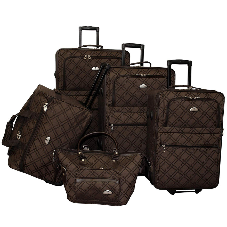 Details: For over 30 years, American Flyer luggage has been designing baggage that is classic, innovative and fashion forward, while being durable and practical American Flyer pemberly buckles 5-piece luggage set includes a 28 inch upright, 25 inch upright, 21 inch carry-on upright, carry-on wheeled duffel and a cosmetic satchel pemberly buckles print styling makes spotting your luggage easy each piece includes a fully lined interior for luxurious touch uprights include roomy exterior pockets for added storage and organization along with an interior zippered mesh pocket and shoe pockets for easy organization uprights also feature telescoping handles, top and side handles for easy mobility along with inline skate wheels for a smooth, quiet rolling wheeled duffel includes a telescoping handle and u-zip opening for quick packing cosmetic satchel includes detachable shoulder strap and exterior pockets for added storage and organization all pieces include self-repairing, nylon zippers product comes in 2 year warranty