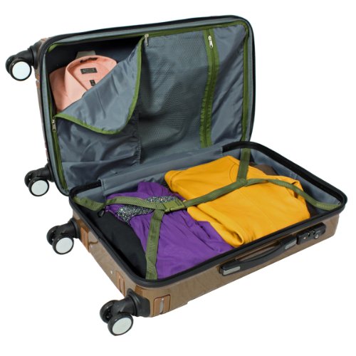 • Polycarbonate construction, expandable, TSA 3-digit combination lock, four 360-degree spinner wheels, fully lined interior, two divided interior compartments, attach a bag strap, retractable handle, deluxe zipper pullers and hardware