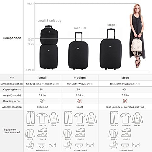 - LUGGAGE SETS SIZE: large luggage18"(L)x10.2"(W)x28.74"(H)&mediuem luggage16"(L)x9"(W)x25.6"(H) carry on lugggage 13.38"(L)x6.69"(W) x11.4"(H) &travel tote bag13.37"(L)x7.87"(W) x21.3"(H)