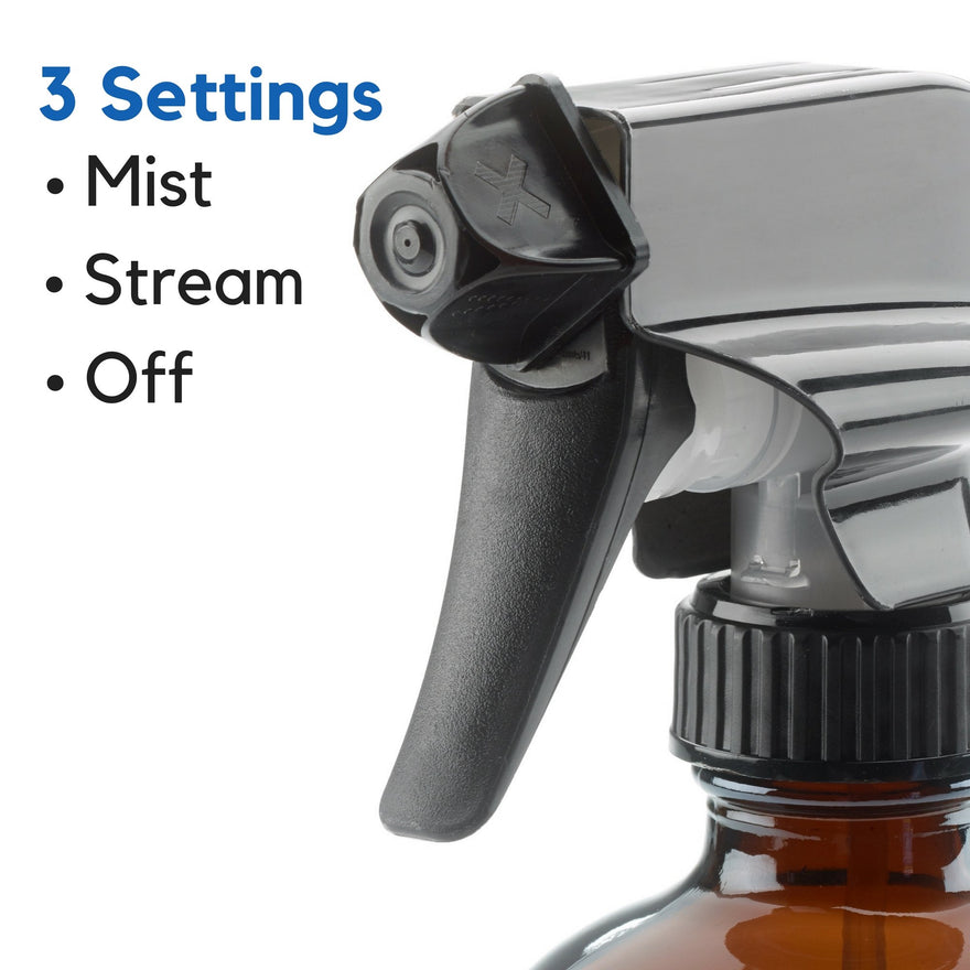 • HEAVY DUTY TRIGGER SPRAYERS (3 FUNCTIONS: Fine Mist, Stream, Off) - Because our glass amber bottles and trigger sprayers are made in the USA, they are the highest quality durable sprayers. This means you don't have to worry about liquids leaking out, what you spray, or how long you spray. This is great because they will last forever and never clog! Simply turn the nozzle to switch between a wide spray, stream, or off settings.