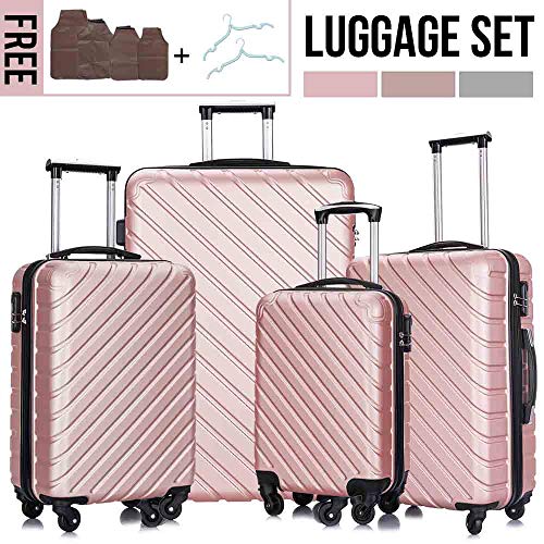 Details: Product description The 4 piece luggage sets include one 18 inch suitcase, one 20 inch suitcase, one 24inch suitcase and one 28 inch suitcase, which allows you to assign all yourclothes in perfect order for your own needs and preferences. The firm codedlock guarantees the security of your luggage. No matter the multi-directionalwheels, or the ergonomically designed telescoping handles will add muchconvenience to your trip. The spacious main compartment and zippered pockets keepyour travel essentials, your small valuables well organized. It is perfect forany trip you may have.Specifications: Color:Rose Gold Material:ABS Materialof Lining: Polyester Materialof handle: Aluminium alloy Overall Product Dimensions: 18’’:12.99’’(L) x 7.68’’(W) x 20.07’’(H) approx 20’’:14.37’(L) x 8.86’’(W) x 22.24’’(H) approx 24’’:17.91’’(L) x 10.24’’(W) x 26.18’’(H) approx 28’’:20.87’’(L) x 12.20’’(W) x 30.12’’(H) approx Product Capacity: 18’’:28L 20’’:38L 24’’:65L 28’’:94L Package Included: 1x 18’’ Trolley Case(This one does not have the side handle) 1x 20’’ Trolley Case(This one does not have the side handle) 1x 24’’ Trolley Case 1x 28’’ Trolley Case 4x Case Packages 2x Folding Coat Hangers