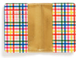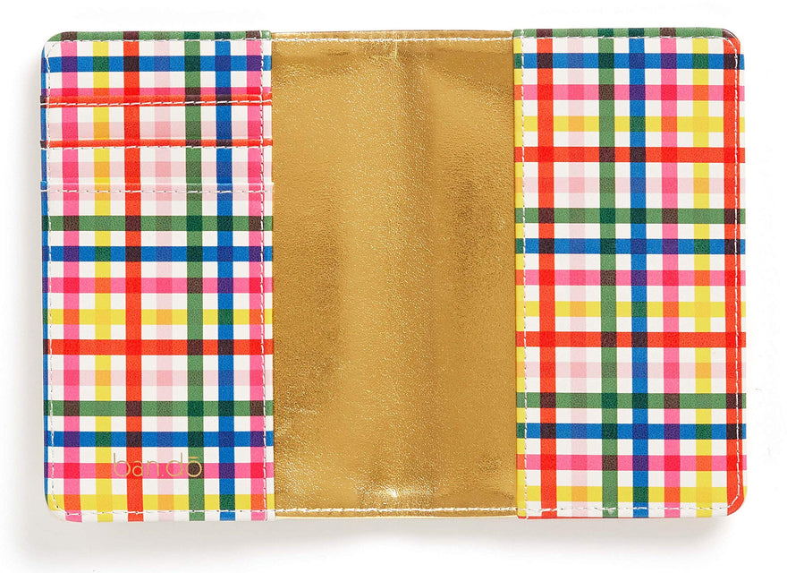 • FUN PATTERN: Passport wallet is featured in an off-white exterior with saying, "have the best time". Interior is featured in a multicolored plaid design with a metallic gold lining