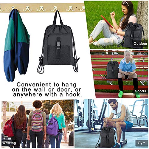 - CONVENIENT MULTI POCKETS:These black drawstring backpack has front zipper pocket, which perfect to keep a kindle, ipad, sunglasses, and other small items. The inside pocket can hold small valuables such as wallet, cellphone, keys to prevent any pickpockets. Another front mesh pocket with elastic and adjustable buckle can prevent items from falling. These Our string backpack can help you to keep the things separated and easy to be found.