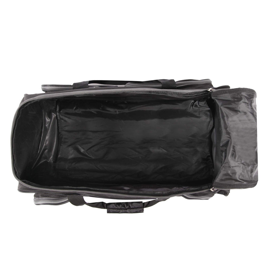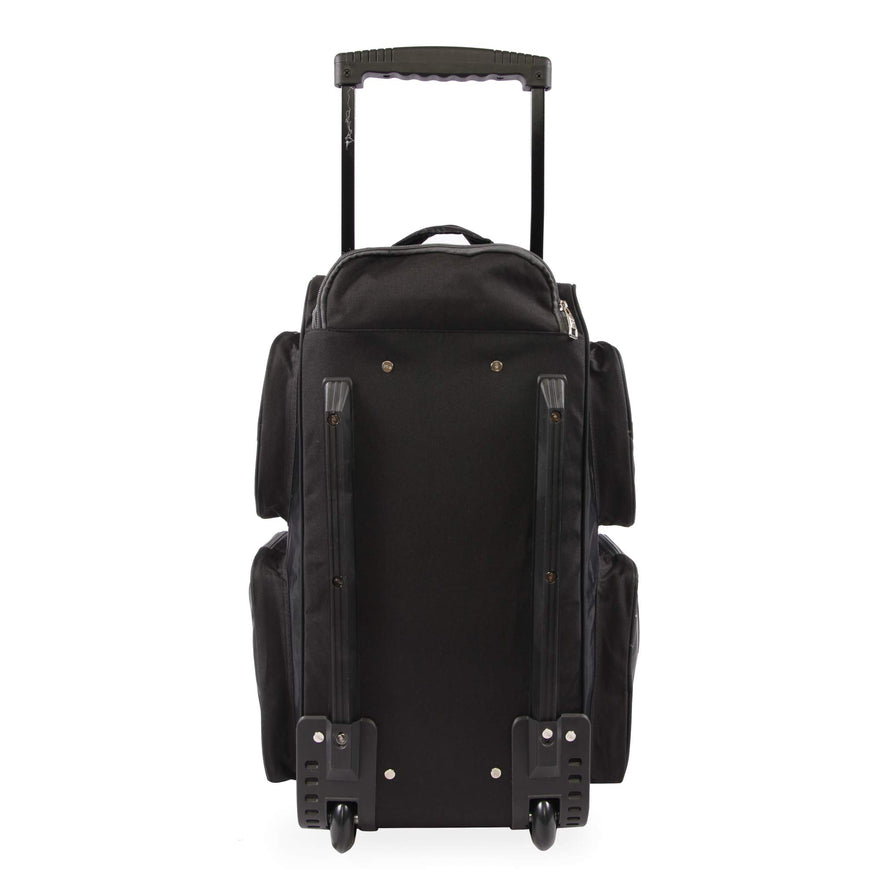 Details: Travel easily with everything you need with this small rolling duffel bag. A full zippered main compartment allows you to easily access almost everything packed inside this rolling duffel bag. Four side zippered pockets makes your items easy to access. A bungee cord allows you to store your jacket or other lightweight items. Carry on size.