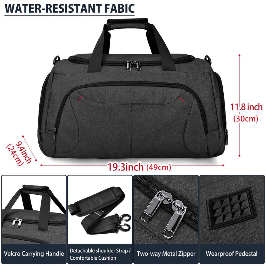 - ✔ DURABLE & WATER RESISTANT MATERIAL - Gym duffle bag is made of high-quality polyester fabric, shockproof and better tear-resistant with high-density nylon lining. Heavy-duty zippers and hardware provide long-lasting durability against daily activities. A non-slip wearproof pedestals are added to the bottom of the sports bags, provide more secure and stable protection when go out by car or flight.
