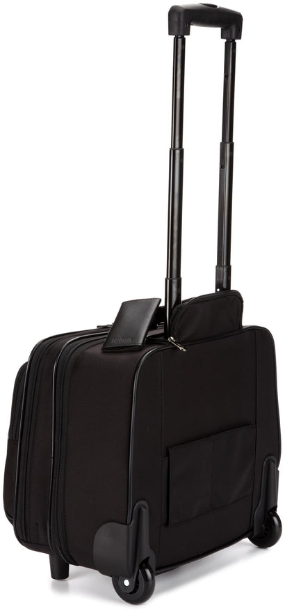 - Aluminum telescoping handle with push-button locking system zips away when not in use; convertible back pocket slips easily over Mobile Traveler Handle