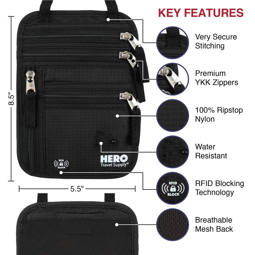 That's why we custom designed the HERO Neck Wallet, an all-purpose passport holder for both men and women that stores credit cards, currency, tickets, and more; and protects them all from theft with discrete, hidden comfort and RFID blocking technology.