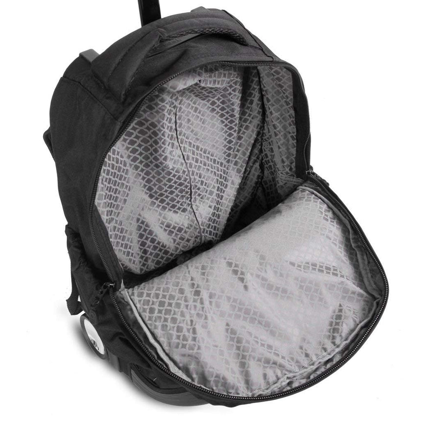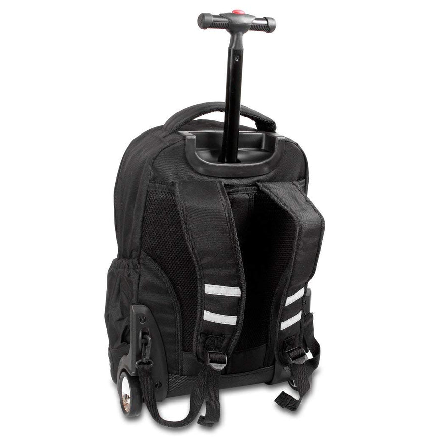 • Pack everything you need for a day at work in this 18-inch rolling backpack by J World. This design features a telescoping handle, durable 600 denier polyester construction, air-cushioned shoulder pads, and multiple organization pockets.