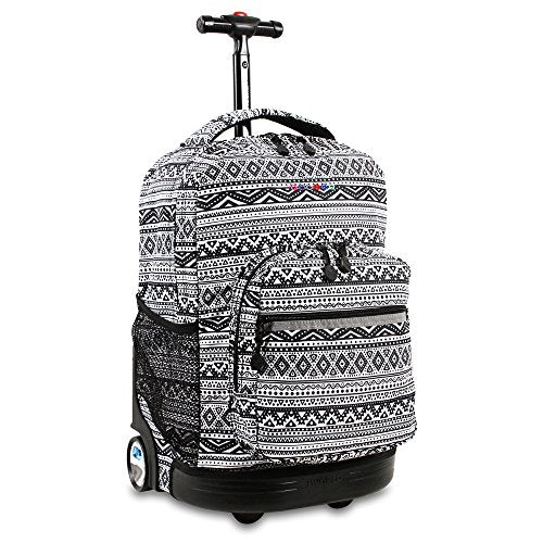 Details: J world new York sunrise rolling backpack features a main compartment, a front pocket with organizer, a telescoping single handle, side mesh pockets, a shoulder strap slip-in system, and a color matching bottom mold. Comes with a free Jojo pencil case!
