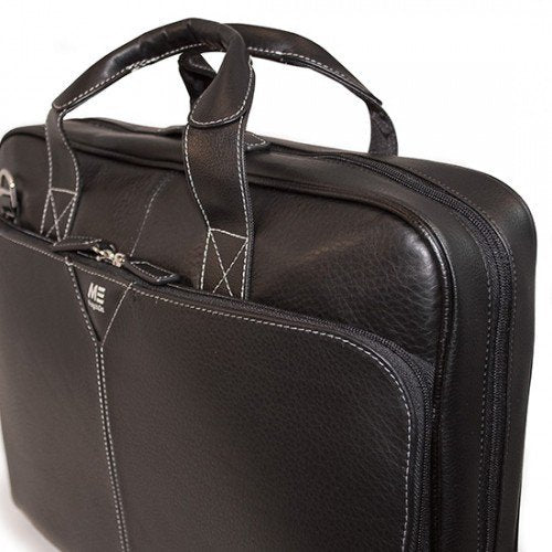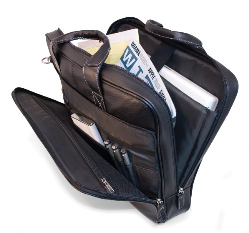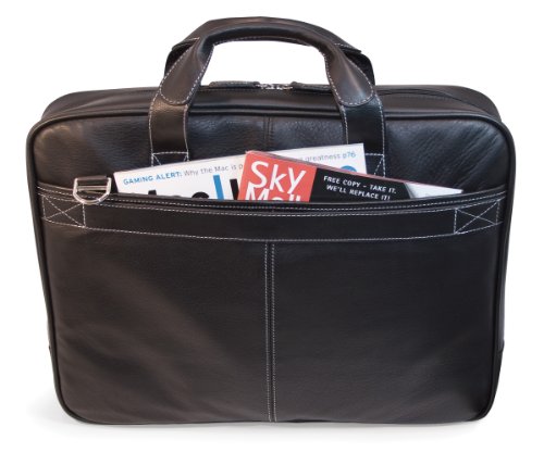 Details: The Deluxe Leather Briefcase is the perfect case for the professional with a sense of style. This sleek leather laptop case is built with rich full-grain cowhide that is both soft to the touch and yet extremely durable. Stylish contrast stitching and polished nickel fittings enhance the elegant design. In addition to the padded computer pocket, there are two full-size interior compartments for your work papers, legal-size file folders and travel accessories. An easy-access zippered exterior section features elastic pockets for your cell phone, plane tickets, pens plus a full-length secure mesh pocket for travel receipts or other miscellaneous items. Other features include leather carry handles, a removable/adjustable shoulder strap, polished nickel fittings, a full-size back magazine pocket and a convenient trolley strap. Fits widescreen PC laptops up to 16" and 17" MacBook Pro.