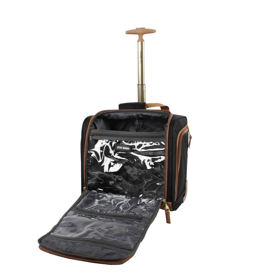 Steven Madden Luggage Soft Side Luggage delivers great durability together with a fashionable design. It is made from polyester fabric to provide your belongs with maximized protection. The use of 360 degree spinner wheels and telescopic push button handle system enables high stability over a variety of surfaces especially crowded airport. This sharp looking piece with Steve Madden signature lining will keep you traveling in style.