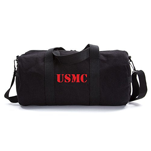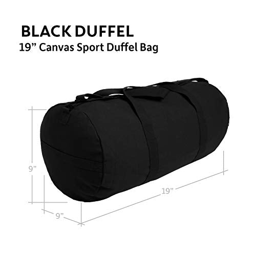 Versatile canvas duffel bag. It has a heavyweight cotton canvas pocket, adjustable shoulder strap, and web carry handles. The medium measures 19" by 9," while the large measures 24" by 12". It has an enormous main compartment that can fit your weekend's worth of goodies, or daily activities. It is great for school, work, traveling light, and many more.