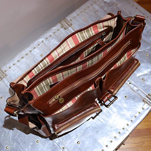 Details: The Roma Roller Buckle Messenger Bag is easy to open and close thanks to the smooth, high quality roller bar buckle. Roma is made with full grain vegetable tanned calfskin leather and solid brass hardware. This messenger bag is feature rich - the inside has two gusset compartments that are 2.5 deep each, two gusset pockets (7 x 7 x 1.5, two zip gusset pockets (6 x 5, two side umbrella cargo net pockets (2 x 2 x 9, two inside zip pockets, leather smartphone pen card organizer, outside 14 x 9 zip pocket with rolling luggage handle insert option, key holder, and a detachable strap that is backed with cotton webbing for comfort and grip.