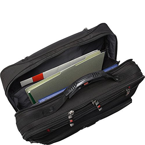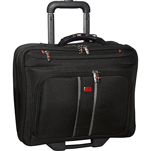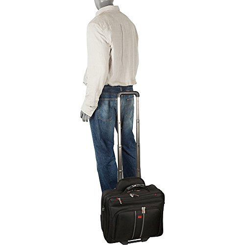 Details: With plenty of pockets to organize all of your personal and professional items, this rolling laptop case is perfect for all types of business travel. The Mancini Leather Goods CompuRoller-Double Compartment Wheeled Laptop Briefcase is made from ultra durable ballistic nylon fabric and features a retractable push-button locking handle system with smooth rolling wheels that make it easy to maneuver. This rolling briefcase includes a roomy main compartment with a protective laptop pocket, a divided compartment for legal sized folders, and an organizer compartment with pockets to hold your cell phone, pens, business cards, and other small accessories. Other features of this case include wheel protectors, a rear kick plate, and self-repairing zippers for long lasting use.