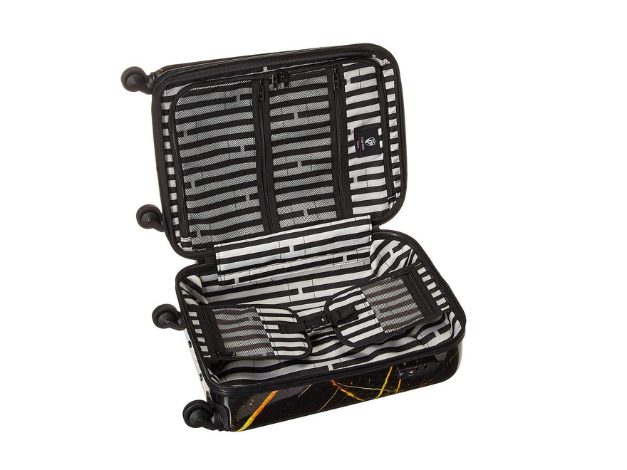 Details: Size requirements vary among airlines. Please check with your airline for carry-on luggage size restrictions. Be a fashionable globetrotter with Heys America® featuring print designs that reflect the latest runway trends. Constructed from a lightweight and durable polycarbonate composite with a marble graphic print throughout and tonal trim. Gold colored accents. Top and side carry handles made from lightweight aluminum. Zip expansion system gives you an extra 20% packing capacity. Mounted TSA lock for your security during travel. Fully lined interior with a stylish patterned fabric. Interior features a zip compartment and an open compartment with a compression panel. Four interior zip mesh pockets for the ultimate packing and organization experience. Four 360° spinner wheels to effortlessly maneuver you through the airport. This case features the Heys America 5 Year Prestige Class Warranty. Imported. Measurements: Width: 14 in Depth: 10 in Height: 21 in Weight: 6 lbs 13 oz