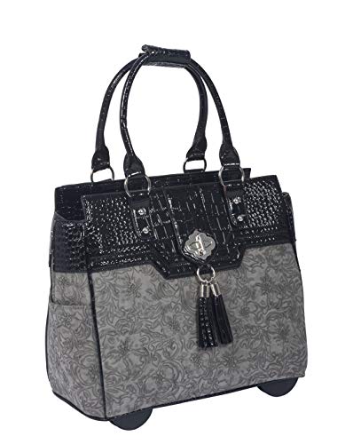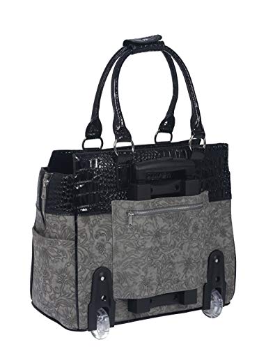 Details: Sophisticated with maximum functionality. Grab your laptop, iPad, tablet, books, files and off you go! The perfect spacious rolling tote for work, school and travel. Look stylish wherever you go with this gray floral and black alligator faux leather rolling tote holdall carryall bag. ------------------------------------------------------------------ Description: rolling briefcase, roller briefcase, ladies laptop bag, wheeled briefcase, rolling computer bag, briefcase on wheels, briefcase with wheels, briefcase, rolling laptop case, mobile office, women's mobile office, true blue. Makes a great nurse gift or graduation gift for any nursing student, law student, teacher, teaching student, graduate, business student, medical student, medical school graduation, social worker, engineer, graduation gifts.