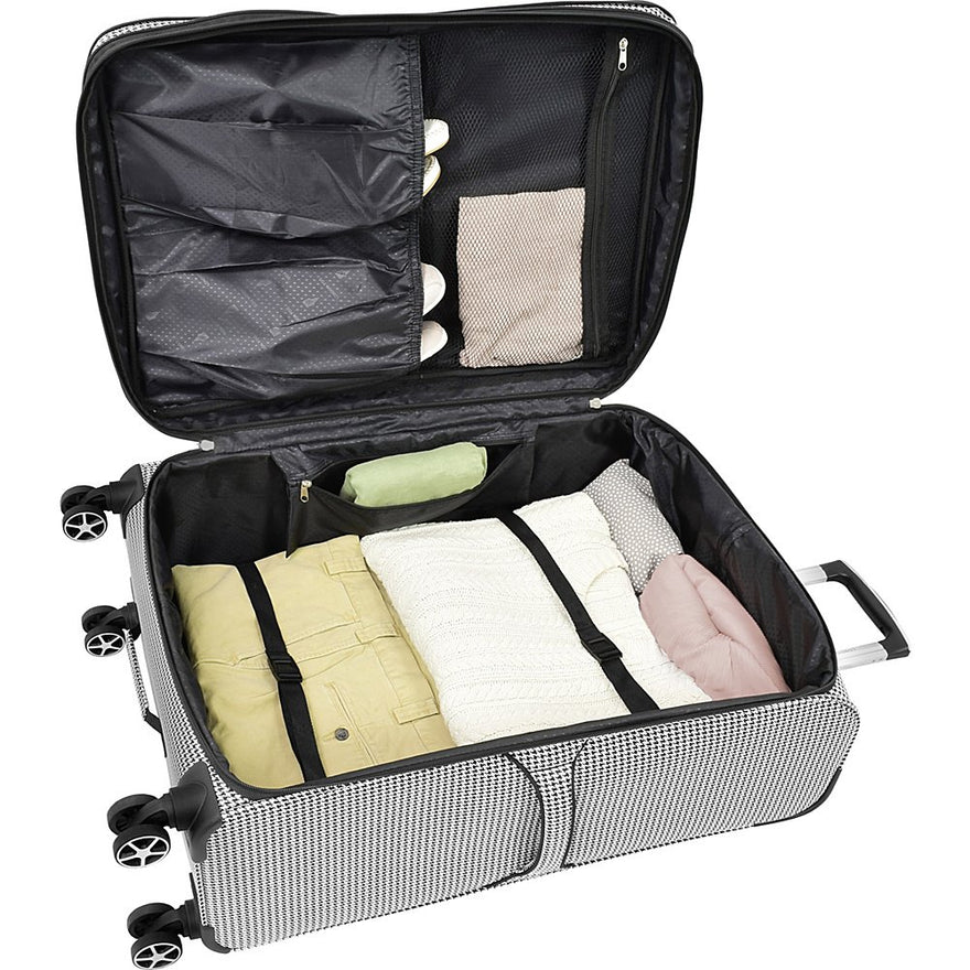 - Spinners have 8-low profile 360 multi-directional wheels, interior shoe pockets and a zippered mesh pocket on lid.