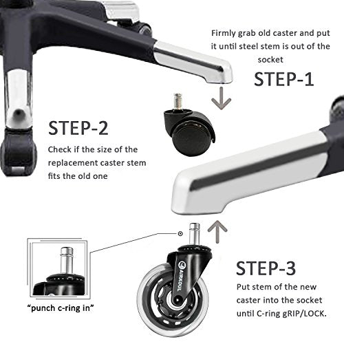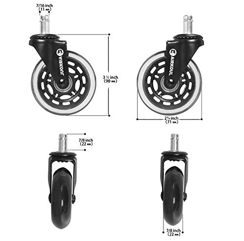 Details: Airkoul casters replacement rubber rolling chair wheels are guaranteed to protect your floors from scratches and marks on any surface. This includes hardwood floor, tile, laminate, carpet,mats, concrete, stone, vinyl, etc.