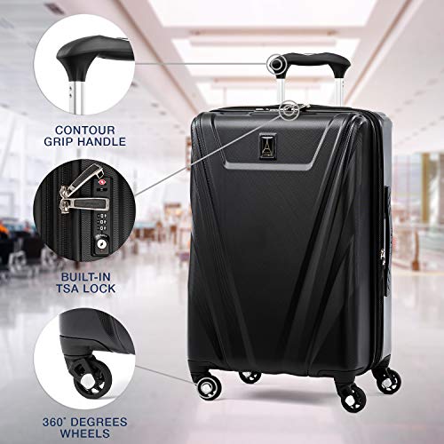 Details: Finally, an expandable, hard sided carry-on bag that is ultra-durable and ultra-light! the Maxlite 5 expandable carry-on hardside spinner is designed to meet carry-on size restrictions for most domestic airlines while maximizing how much you can pack inside with its convenient 2" expansion option. The ultra-durable, ultra-lightweight polycarbonate shell is specifically engineered to be flexible upon impact, protecting contents while resisting cracking or splitting. Additional exterior features help protect the bag from wear and tear, including the shell's textured surface, which helps reduce visible scratching or scuff marks, and molded corner guards that serve as built-in bumpers on high-wear points. Integrated lock allows TSA authorities to safely unlock and lock suitcase for inspection when needed (default lock code is 0-0-0 to open). This bag is great for short and medium-length trips, with a split case construction and interior divider panel that provides separate packing compartments. Elastic hold-down straps keep everything in its place. Roll with ease on four 360 degree spinner wheels guided by the lightweight, height-adjustable PowerScope lite handle with comfortable Contour grip. Backed by Travelpro built for a lifetime limited warranty with our trusted companion promise which covers the cost of repair for damage from airline or other common carrier for 1 year.