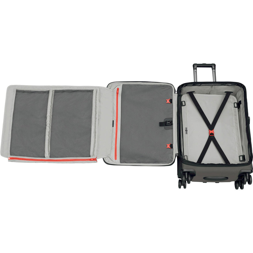 - Pack More divider is adjustable in height and creates a flat packing surface for wrinkle-free transport of clothing