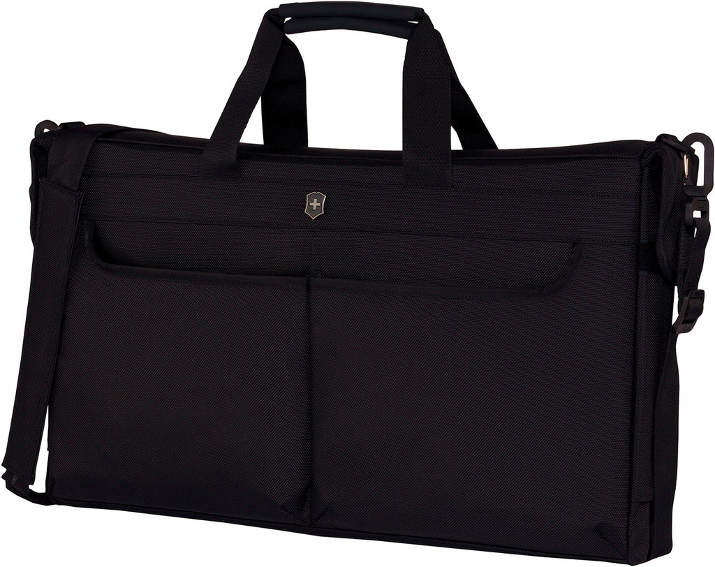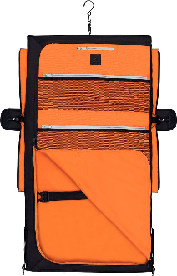 - Interior features hanger clamp, two foam bolster compression straps to minimize wrinkles, a zippered mesh tie pocket and a large zippered mesh storage pocket