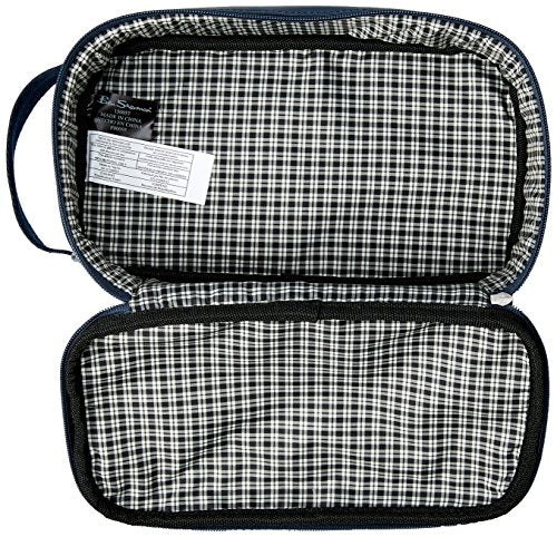 Details: Smooth polyvinyl chloride bucket style single compartment zip around travel kit. Durable, smooth polyvinyl chloride exterior with color accents and fully lined check printed interior. Zip around construction allows easy access to the main compartment which is designed to fit all travel toiletries/essentials. Front exterior full length zipper pocket for smaller necessities. Rear exterior features an open top pocket with secure closure for additional storage. Convenient side webbed grab handle for easy carrying. Size: 10.5 With x 6.0 H x 3.5 D.