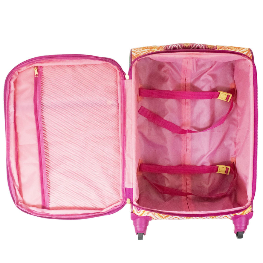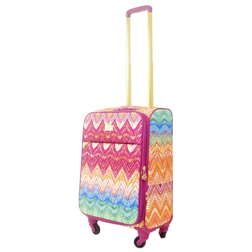 Details: Your worldwide adventures start right here with the chevron soft sided rolling luggage suitcase. It is made with soft polyester fabric with an exciting chevron print. This luggage is mobile on multi directional spinners with smooth, 360 degree wheels. A matching telescopic pull handle has a stylish gold metallic finish and is made from aluminum. The full body main compartment offers ample room for your clothes, souvenirs, and so much more! you can also secure your clothing with built-in compression straps and help pack more. It also includes an interior zipper mesh compartment; perfect for keeping your travel bottles secure. Finally, the suitcase has a 2 inch zipper gusset that lets you expand your storage space.
