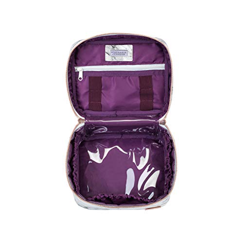 - The roomy interior features elasticized pouches to keep bottles and other toiletries in place, while the clear plastic lining provides an easy-to-clean surface.