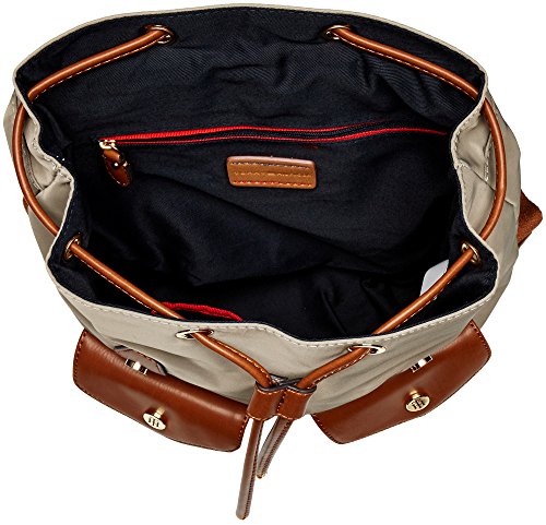 Details: Nylon backpack for women featuring two front snap pockets, a flap main compartment, and gold hardware. Flap with double buckle and drawstring closure. Flat bottom, top handle. Adjustable shoulder straps with gold hardware detail. Lined nylon interior with wall zip pocket and slip pocket. This Tommy Hilfiger backpack purse is a versatile essential, the perfect nylon backpack for work or play. Our stylish women's backpack will keep you organized while on the go. 11 length; 12-1/4 height; 6-3/4 width; 4 drop.