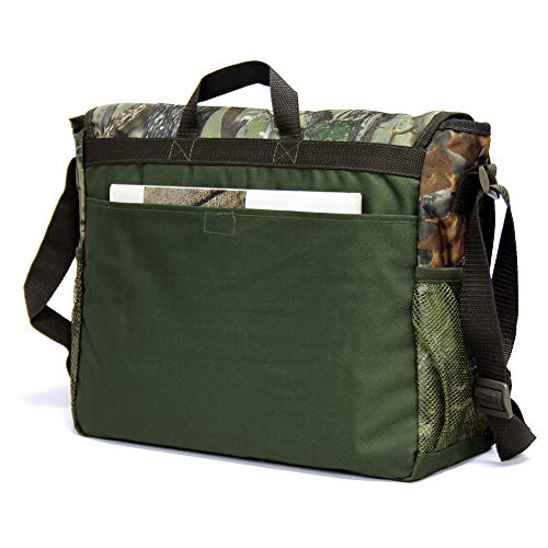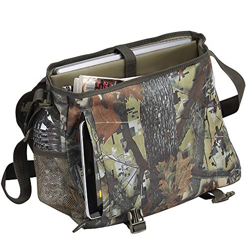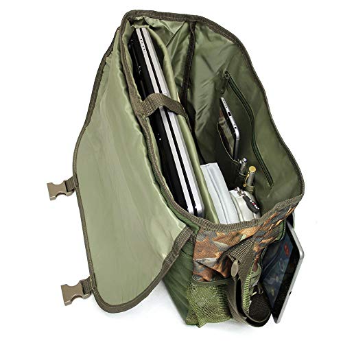 Details: Take technology to the great outdoors with this clever camo messenger Its flap closure is secured by dual buckle clips, and beneath the flap theres a subtle vertical zip padded pocket to secure a full-size tablet. The main compartment has padded sleeve to accommodate a 15.4 laptop. Additionally, it has a pen loop and pocket for keys or phones, along with a zip pocket for smaller essentials and