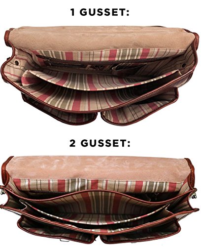 Details: Firenze Buckle Strap Briefcase is made with full grain vegetable tanned calfskin leather and solid brass hardware. This leather was hand tanned Etruscan style in Santa Croce to soften, patina, and develop a silky touch. Only vegetable extracts and natural oils were used to create rich, vibrant color and a tender, semi-gloss finish. Firenze Buckle Strap messenger bag is feature rich - the inside has a 2" x 13" x 9.5" padded laptop pocket, two gusset compartments, leather smartphone / pen / card organizer, inside zip pocket, outside 16" x 10" zip pocket and rolling luggage strap. This leather briefcase comes in two sizes - 1 Gusset or 2 Gusset. The 1 Gusset has 1 compartment that is 3.5" deep, the 2 Gusset version has 2 compartments that are 1.5" and 2" deep). Made in Italy.