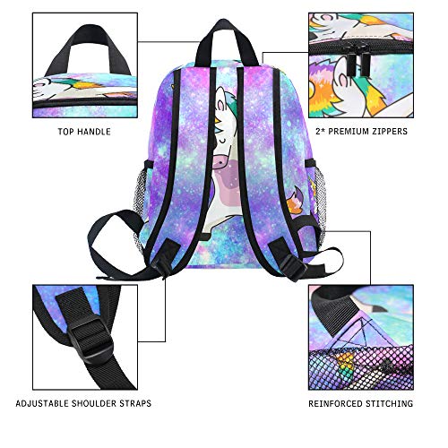 -- With the perfect size of 10"x 6" x 12", the galaxy unicorn backpack for girls/boys can effortless store preschool student’s personal items. Cute toddler backpack with 1 extra large main compartments, 1 inner small pockets, 1 front pocket and 2 side pockets make your dear children keep all their stuffs organized and get all stuffs easily and quickly. -