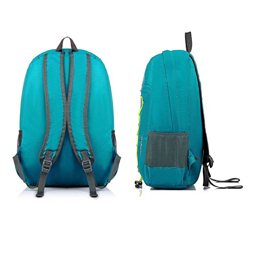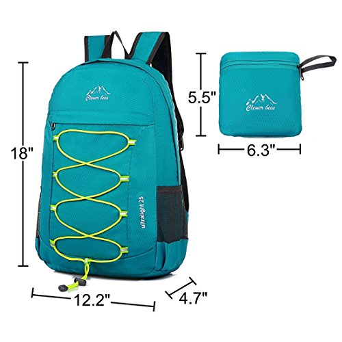 Details: REFLECTIVE STRIPS DESIGN.Decorative bright green shoeslace design makes backpack looks fashion and young.Refective Strips allows you to be found in dark from headlights more easily.COMPACT.Folds into zipped inner pocket to fit anywhere, and unfolds from pocket to backpack in seconds. A must have for every trip.MULTI COMPARTMENTS and KEEP THINGS ORGANIZED. Features a classic shape with several pockets for storage and organization. This backpack has a roomy main compartment, one front external zipper pocket to hold your phone or small accessories, one interior security zippered pocket for valuable items, one interlayer for hold your iPad or laptop and two side pockets for water bottle or umbrella.LIGHTWEIGHT (0.5 Pounds) and ROOMY (25L). A true space saver. Stuff the bag into its own pocket for storage---no extra fees, and unzip it when you reach your destination. Avoid overweight charges, simply unfold from your luggage and use it as a carry on for your excess baggage.DURABLE. The backpack is made from water resistant nylon material, provide strengthen and long-lasting performance with minimal weight. Stress points are reinforced with bar tacking for increased longevity. Durable 2-way abrasion resistant metal zipper across the backpack.Dimensions: Unfold 12.2 x 4.7 x 18 inches / Fold 6.3 x 5.5 x 2.8 inches.Due to different methods of measurement, please allow 1-3mm dimension deviation. Thank u for your understanding.Available Colors: Black,Blue,Purple,Teal Color.