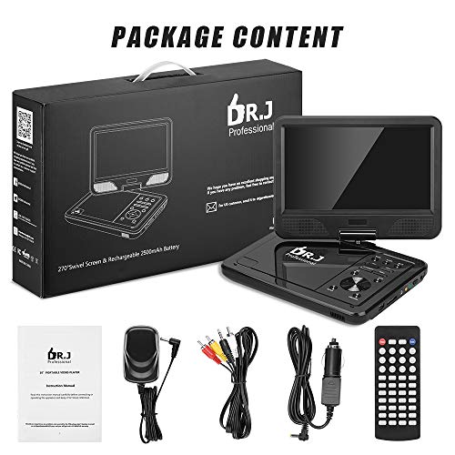 Details: This portable DVD player is equipped with 10. 1 Inch swivel screen and is as light as 4. 6 pounds. It's designed and manufactured by our professional team, qualified with the advanced manufacturing process, and the raw material promises top quality and superior product performance. This portable DVD player is a perfect gift for anyone, especially for a long road trip. Main Features of This Portable DVD Player: 1. 2500mAh high-capacity rechargeable battery s you at most 5 hours of playing your favorite movies on-the-go. 2. The included 1. 8m AC adapter and car charger make it impossible to happen that the battery runs out in a short time. 3. The anti-shock feature ensures you stable and smooth viewing experience even traveling on a rough road surface. 4. The 10. 1 Inch HD swivel TFT screen together with its 270-degree rotation and 180-degree flip feature allows extreme viewing experience and easy positioning. 5. Besides the professional 24-hour after-sales services, we also provide a 30-day money back and 24-month with a replacement or a refund to free you from any hassles of quality issue. Multiple Multimedia Formats Supported: Disc Format: CD, DVD, DVD + R (-R), DVD + RW (-RW), VCD, SVCD-R (RW), CD-R (RW). Supports MP3, MPG, VOB, AVI, DIVX, MPEG and RMVB (maximum resolution 720*576, and for RMVB 720P), JPG and TXT. (Supports discs of all region. ) Supports USB, SD and MMC card, up to 32G. AV cable is in the packaging, connect to other devices like TV, Projector etc. To connect with another DVD Player, you need additional AV to AV cable. Package Contents: 1x 10. 1 Inch Portable DVD Player 1x Remote Control 1x Car Adapter 1x Power Adapter 1x AV Cable1x User Manual