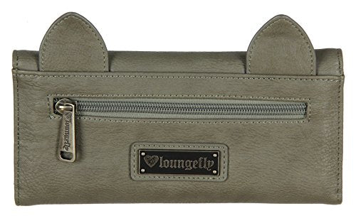 Details: This trifold wallet is perfect for any cat lover.This faux grey leather wallet with a cat face and raised ears features an outside zip pocket, as well as a bill pocket and card slots inside.