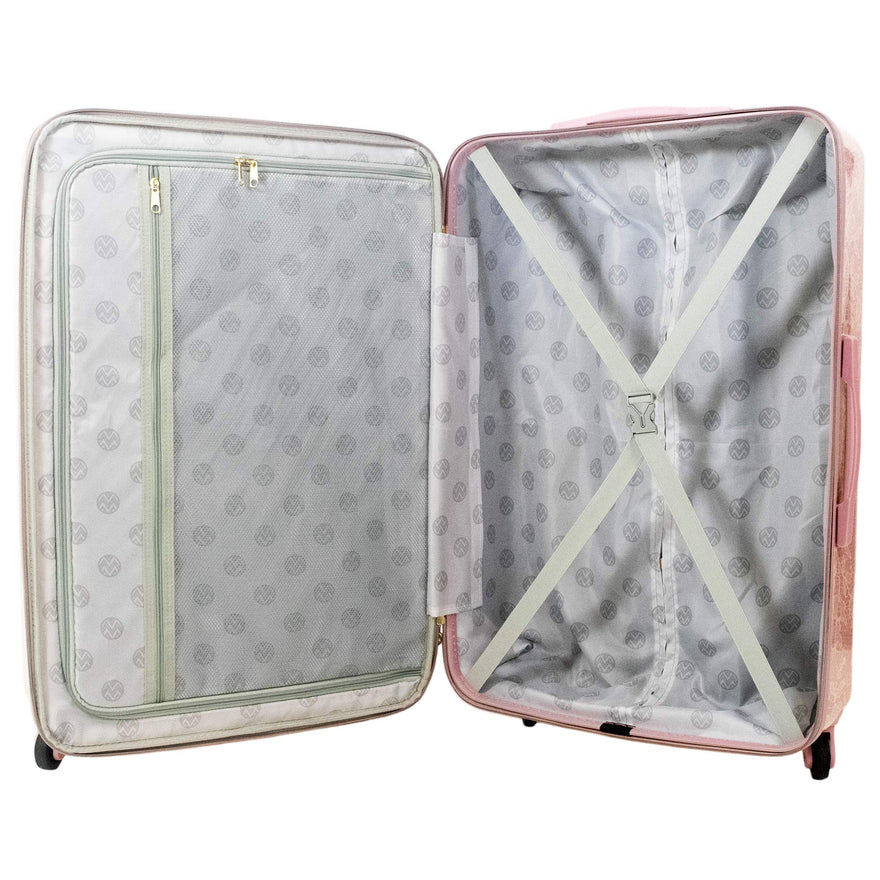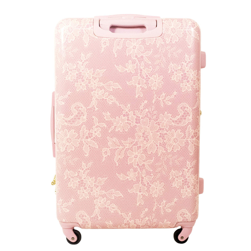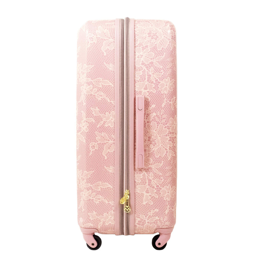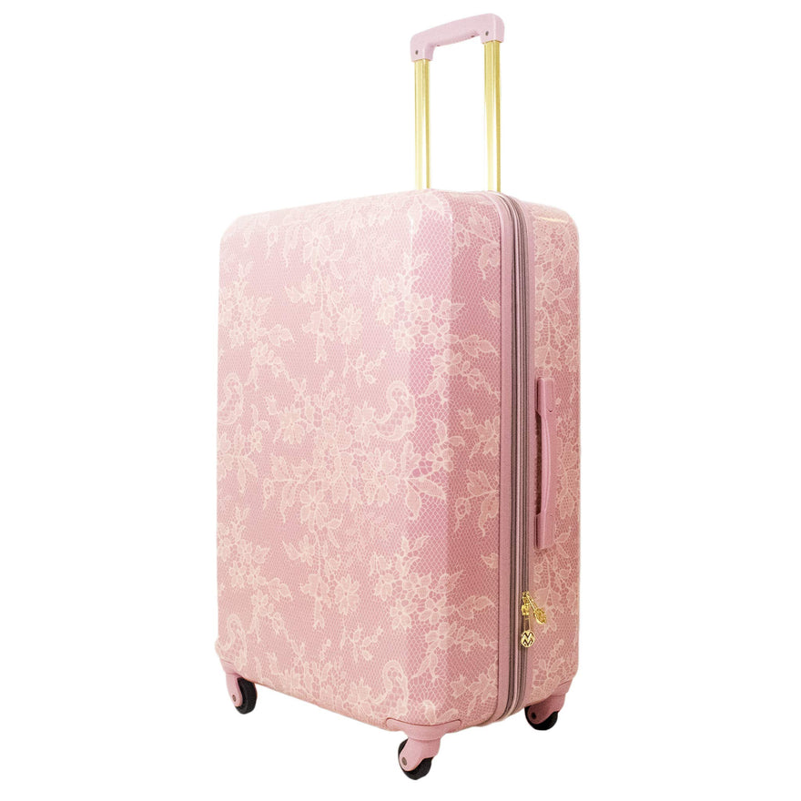 Details: Bring the elegance of lace along with you for your travels with the Macbeth lace texture hard sided 29in rolling luggage suitcase. It is made with durable polycarbonate material that will stand up to the rigors of travel. This lightweight luggage easily rolls around with smooth 360 degree multi-directional spinner wheels. You can roll around in style and comfort with a multi-stage telescopic pull handle that has a gold metallic finish. A full body main compartment has the space you need for clothes, souvenirs, and other travel essentials, while built in compression straps let you pack more and help prevent clothing spills while on the go. It also includes a built-in interior zipper mesh compartment that lets you secure and organize your travel bottles and cosmetics. The luggage has an 2 inch expandable zipper gusset that lets you pack more and expands your space. It is easy to load into overhead bins and cars with retractable top and side panel handles.