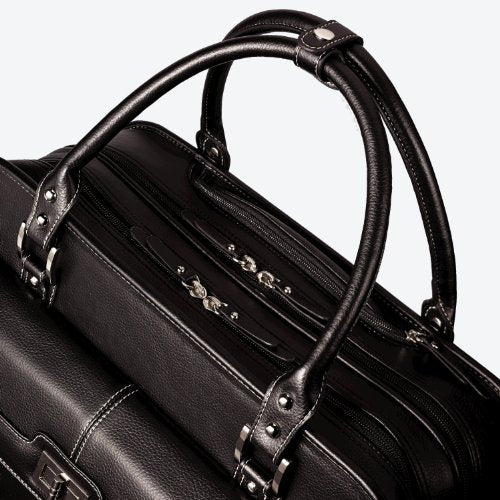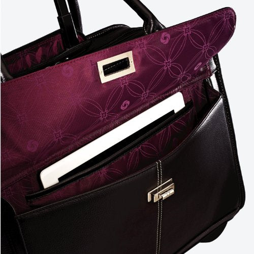 Details: Carry your laptop and other essentials for the daily commute or business travel inside this chic mobile office from Samsonite. The Samsonite Women's Laptop Mobile Office is made from faux leather and features a sleek and stylish design with contrast accent stitching, two top handles for hand toting, a retractable pull handle, and smooth rolling wheels for easy mobility. This laptop case has a dual compartment design with a padded laptop pocket, a rear compartment to hold files and documents, and slip pockets to hold accessories. A separate front organizer compartment includes a pocket for your iPad or table, pen sleeves, and slip pockets to hold small personal items.