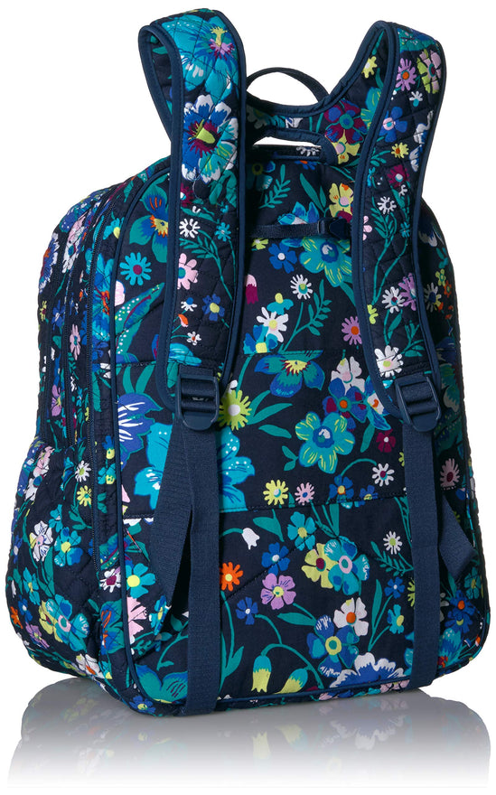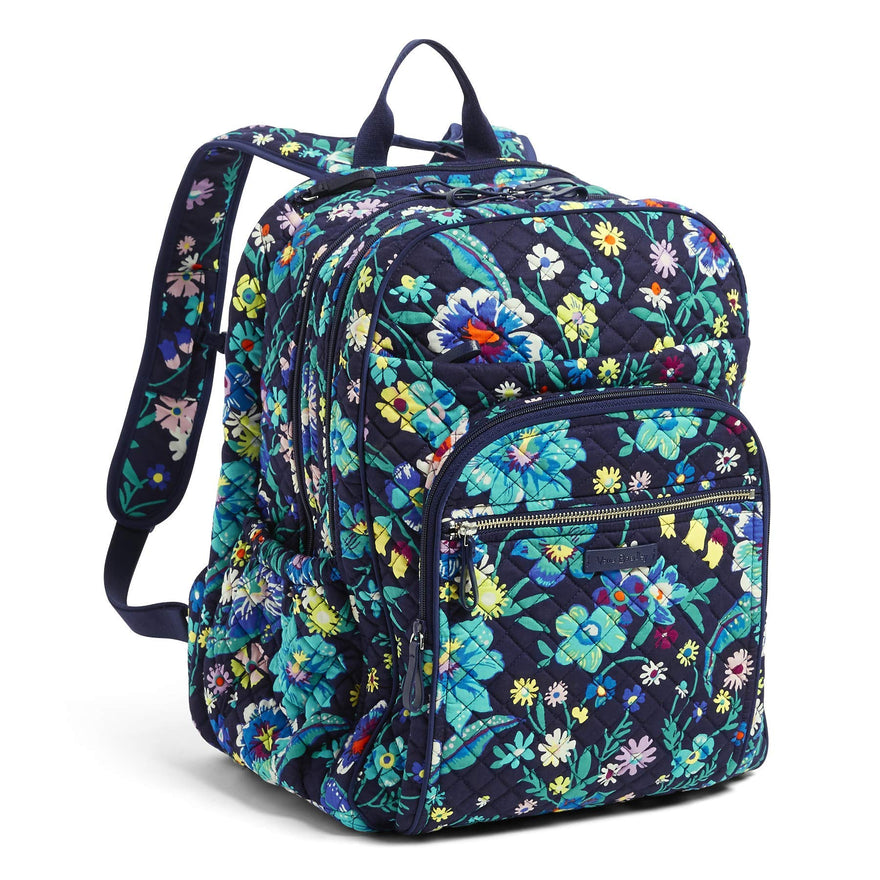 Details: Vera Bradley has crafted a backpack that will get you to your destination with comfort and ease. The iconic XL campus backpack is the fashionable solution for storing your everyday school and work essentials - measuring 16.75 inches high, 12 inches wide, and 8.75 inch in diameter With a 2.75 inch Top handle drop and 32 inch adjustable straps. Fully lined with printed polyester material, The spacious interior features one slip pocket, two mesh slip pockets, and a cushioned laptop or tablet sleeve to secure your work material and tech essentials. Crafted from lightweight, polyester microfiber, this bag has a zip around closure that securely fastens your tech essentials and organizes all the accessories that play into your work day. The exterior features two side slip pockets, two horizontal zip pockets, and a front zip compartment with three slip pockets, four pen slips and an id window to keep your essential supplies organized and quick to access. You can throw your most important materials together quickly and safely with ease and organization in the iconic XL campus backpack. When quality material meets precise craftsmanship, you get a work necessity made to last through all of life's journeys. Care: machine wash cold, gentle cycle, use only non-chlorine bleach as needed; line dry.
