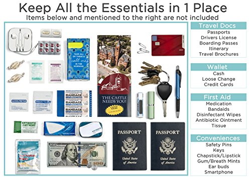 - ORGANIZE ALL TRAVEL ESSENTIALS - With 7 pockets, you have the versatility to stash your valuables to your liking. Carry your iPhone X+, 4 passports, medication, first aid, chapstick/lipstick, credit cards, room key, car keys, itinerary, boarding pass, ID, money, loose change, gum, and more. There is even a loop to carry a pen.