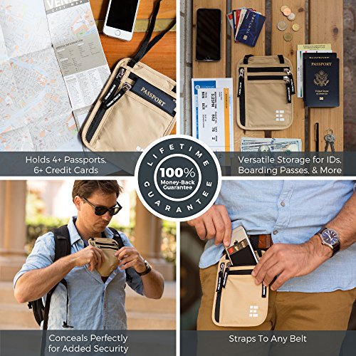 - PROTECTS YOUR VALUABLES & IDENTITY - Conceals cash, credit cards & other valuables from pickpockets. Built in RFID Blocking safeguards your passport, credit cards, and personal information against identity theft. BONUS GIFT - 7 RFID Blocking Sleeves for your ultimate peace of mind (6 Credit Card & 1 Passport) - use when your passport or credit cards aren't inside the neck wallet.