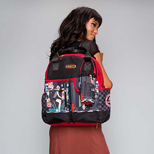 Details: Travel hands-free feeling fabulous and comfortable with the Nicole Lee Diaper Bag With Backpack Strap Version 2 Exterior Features: Exclusive Nicole Lee print all around, made of nylon, metal zipper closure with NL monogrammed zipper pull, dual top handles, 5 exterior pockets to organize all of your baby essentials, bottle holder, adjustable backpack straps with release buckles to hang the diaper bag from the stroller, structured silhouette and NL nameplate at front. Interior Features: Large main compartment, with zip wall pocket at back, 3 mesh multi-functional pockets at front, 2 side pockets that can be use to hold your baby's bottles, includes a changing mat and NL polka dot nylon lining. Vegan leather handles with 7" inch drop. Includes adjustable and detachable " - " inch shoulder strap. Colors available are Elsa's Dream Catcher, Bike Tour, Racing Girl, Hollywood Star, Clara Loves Photo, Baroquely Europe. For cleaning, wipe with damp cloth.