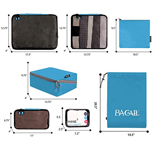 - Items Included: This 7PCS packing organizers includes 3 Packing Cubes(XL: 17.5" x 12.75" x 4",L: 13.75" x 12.75" x 4",S:11" x 6.75" x 4";),1 Bra Underwear Bag(13"x9.25"x4.5"),1 Flat Bag(10.6"X9.5" for electronics accessories;),1 Shoe Bag(20.5"X14.5"),1 Clear Toiletry Bag( 7.2"X5.5"X2.5")