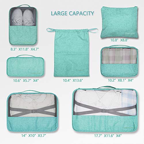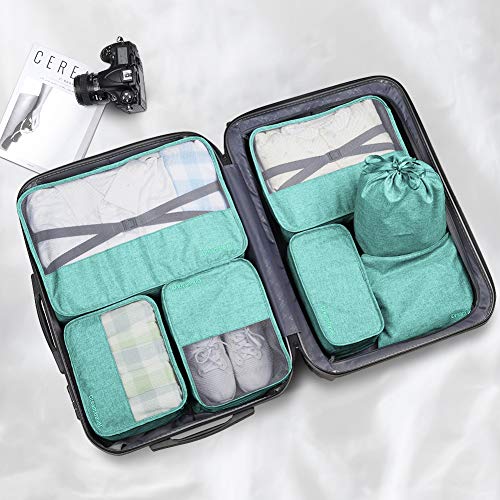 - INCLUDING 7 PCS TRAVEL LUGGAGE ORGANIZERS: Includes 3 different sizes of packing cubes organizers( large:10-12 shirts, medium:7-9 Shirts, small: 5-6 shirts), 1 bra underwear bag, 1 Shoe bag, 1 laundry bag and 1 zippered bag. Easy to pack your all luggages well in your 21-25 inches suitcase, carry-on bag, drawers and backpack, great for short or long trip